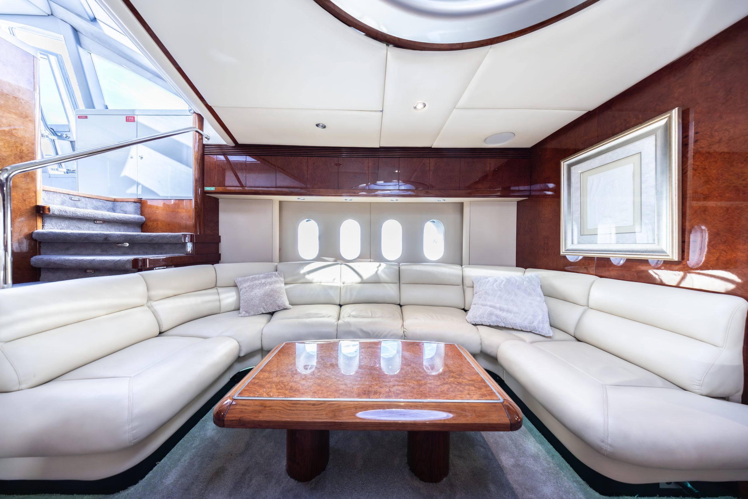 Inside, natural light streams through a retractable sunroof, revealing a refined interior where contemporary design meets comfort. The open aft deck invites relaxed conversations and sun-soaked moments, while the air-conditioned lounge below offers a calm, intimate retreat — ideal for a quiet chat or a dedicated space for kids to unwind with TV and games.